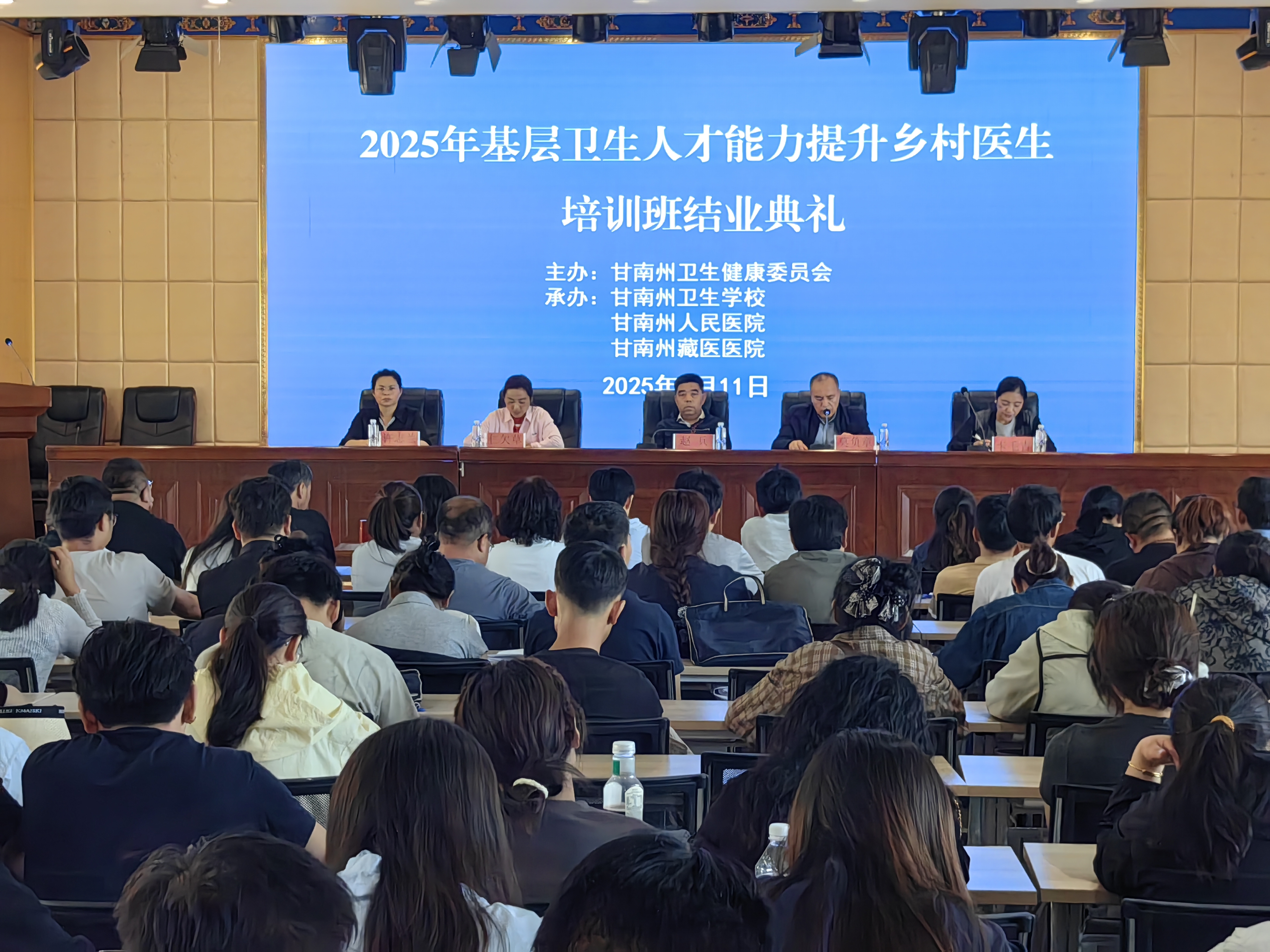 2025年7月11日15时,“2025年基层卫生人才能力提升乡村医生培训班”结业仪式在甘南州卫生学校综合服务楼五楼多功能厅举行。学校党总支书记赵兵、副校长莫负章及州人民医院、州藏医院医务科负责人和两地100名学员共同参加结业仪式。