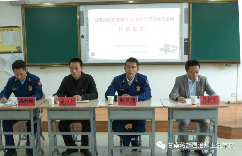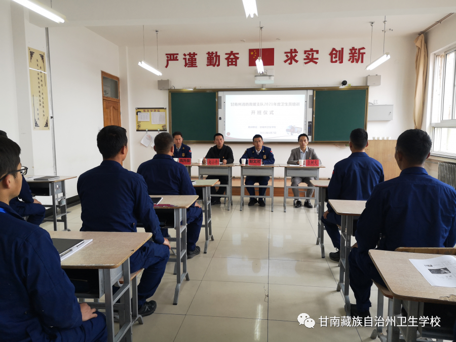 为了提高消防卫生员职业健康从事能力,受甘南消防支队委托,6月7日上午,在我校举行2021年甘南州消防救援支队卫生员培训暨开班仪式。甘南州消防大队副支队长赵文河,学校副校长赵小平、保卫科科长张树天及班主任许志兰和11名消防卫生员参加,开班仪式由后勤保障科科长高升泉主持。