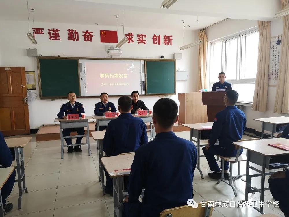 在扎实开展党史学习教育活动之际,为进一步提高我州消防卫生员职业健康从事能力,受甘南消防支队委托,6月7日至17日,我校举办了甘南州消防救援支队2021年卫生员能力提升培训班。培训期间,我校安排了9名骨干教师以理论讲解、视频教学、实践操作相结合的方式授课;培训内容紧密围绕灭火救援实战中的心肺复苏、止血包扎以及火灾逃生及烧烫伤等自救互救急救等知识展开,还涉及常见危重急症抢救、隔离技术、卫生防疫等相关内容;老师们由浅入深、通俗易懂的教学,使学员们愿意听、听得懂、记得住、爱动手,达到了培训的预期效果;经理论及实操考核,他们熟练掌握了医疗救护的基本技能,真正提升了现场自救和急救能力,更好地服务实战需要。