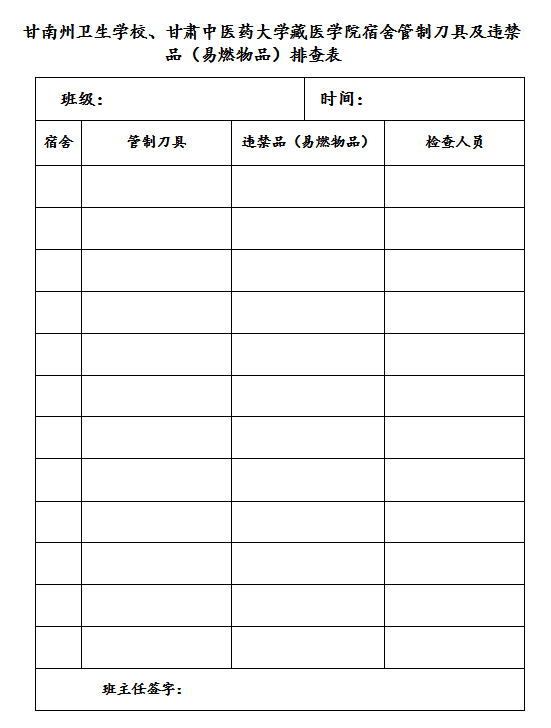 甘南州卫生学校、甘肃中医药大学藏医学院宿舍管制刀具及违禁品(易燃物品)排查表