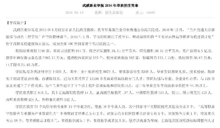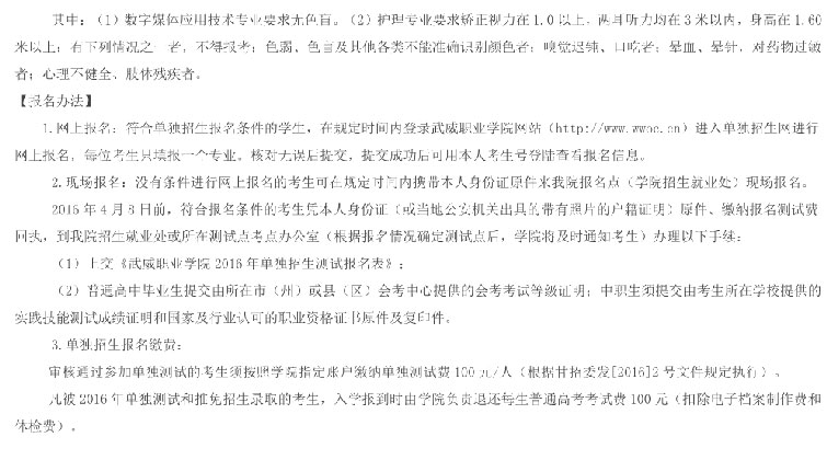 武威职业学院2016年单独招生简章