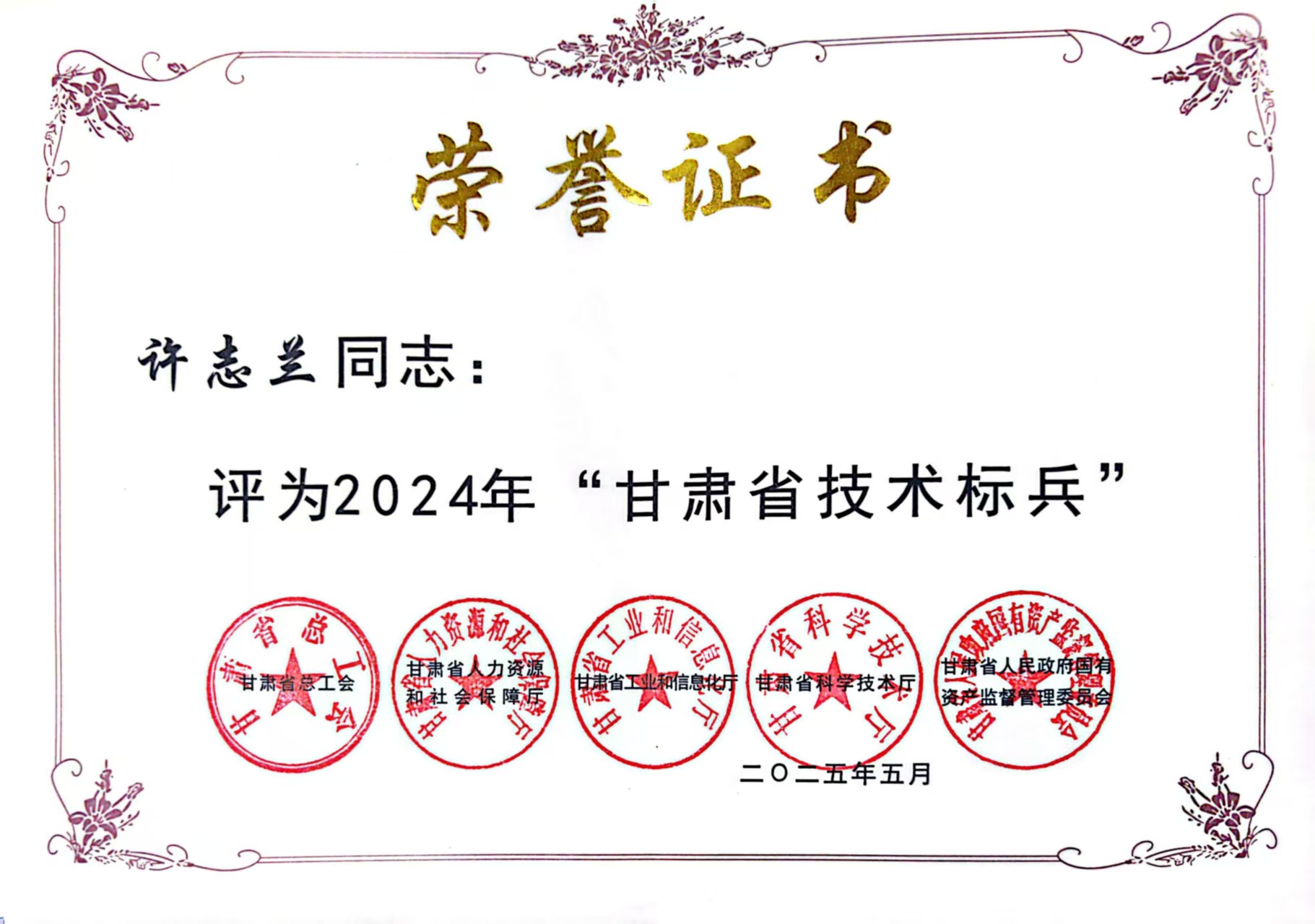 我校教师许志兰荣获2024年“甘肃省技术标兵”称号