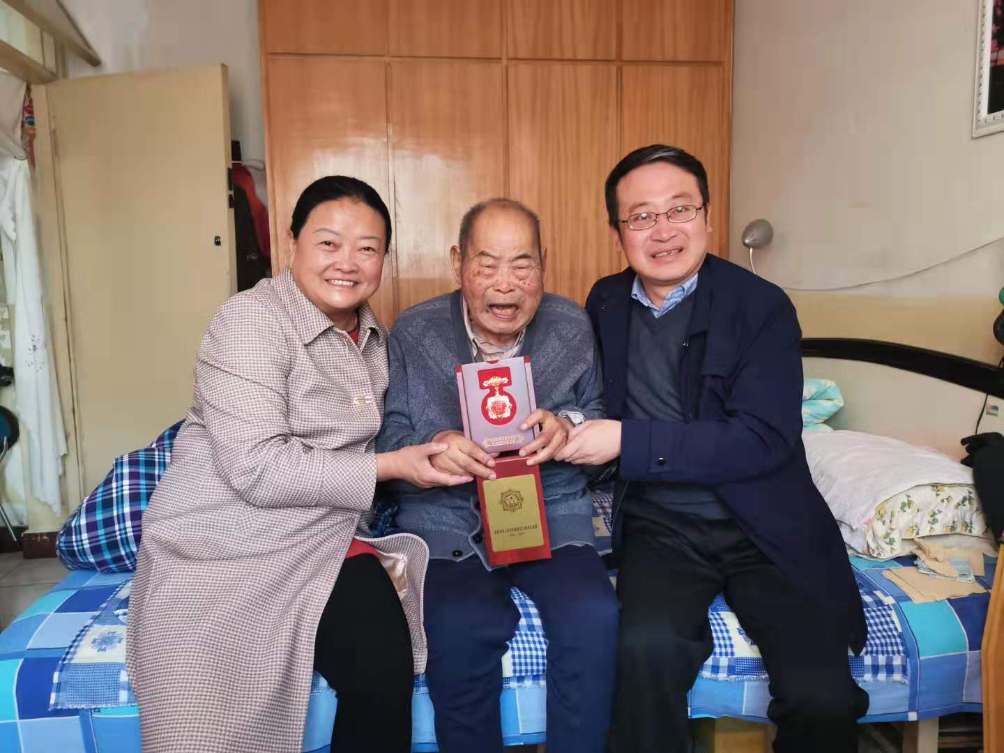 为隆重庆祝中华人民共和国成立70周年,根据《关于认真做好“庆祝中华人民共和国成立70周年”纪念章发放工作的通知》州人社字【2019】410文件精神和州卫生健康委党委要求,9月27日上午,甘南州卫生学校党总支书记、校长赵苏静同志、甘南州卫生学校党总支副书记、副校长黎昱民同志一行4人,赴我校离休老干部陈衍耐家中送去中共中央、 国务院 、中央军委颁发的“庆祝中华人民共和国成立70周年”纪念章及慰问品。赵苏静同志转达了上级部门的亲切关怀,向子女询问陈老的身体状况、日常起居和陈老进行了愉快的交流,收到纪念章的时候陈老十分开心,老人连连道谢,感谢党和政府还惦记着自己。