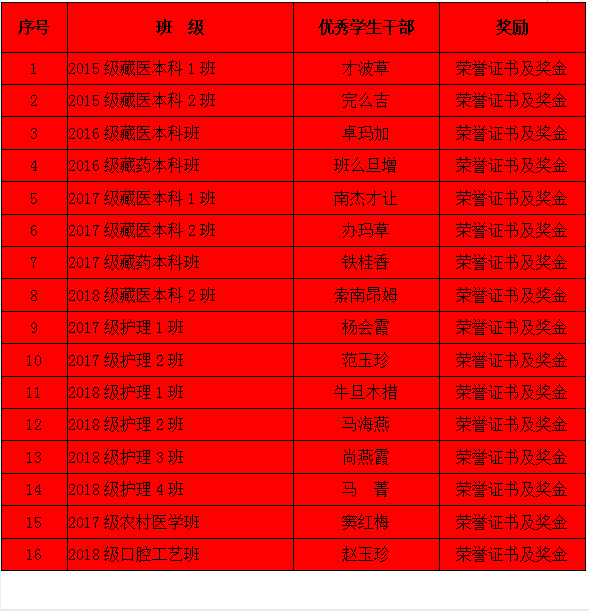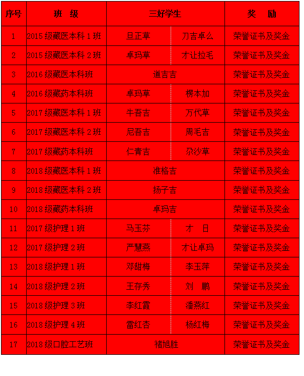 大会表彰了才波草等16名优秀学生干部、旦正草等29名三好学生和4个先进班集体。此次评优选先活动,充分体现了“公开、公正、公平”的原则,所评选出的三好学生、优秀学生干部和先进班集体,集中体现了我校(院)学生积极、健康、向上的精神风貌,是全校(院)学生和班集体的优秀代表和榜样。