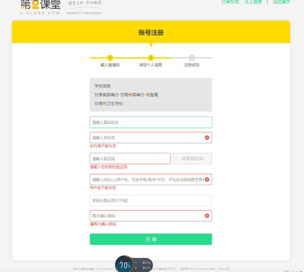 (二)学生可使用邀请码注册登录网页学习并完成听课任务,步骤与班主任登录相同。