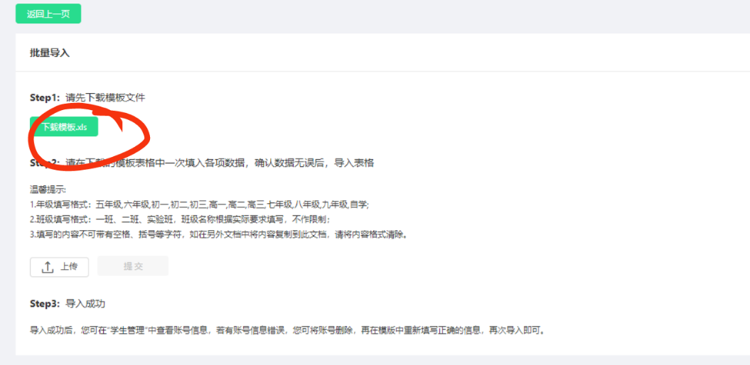 3. 进入后台,学生管理,点击导入,下载模板,录入班级学生信息后上传,提交,自动生成邀请码。(注:年级填写为自学 班级填写为xx级xx班)